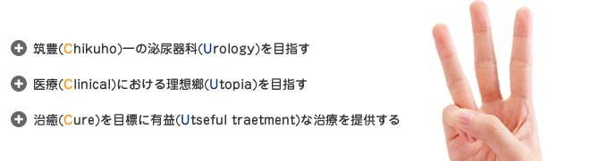 以上の3つの診断理念より、診療所名を"泌尿器科C.U.クリニック"と名付けました。英語を話す国では、親しい間柄の別れのあいさつを「シー・ユー(See you)…じゃあ、また会いましょう」と言いますが、私たちと地域の皆さんの間でこのような信頼関係が築けられるように努力していきます。